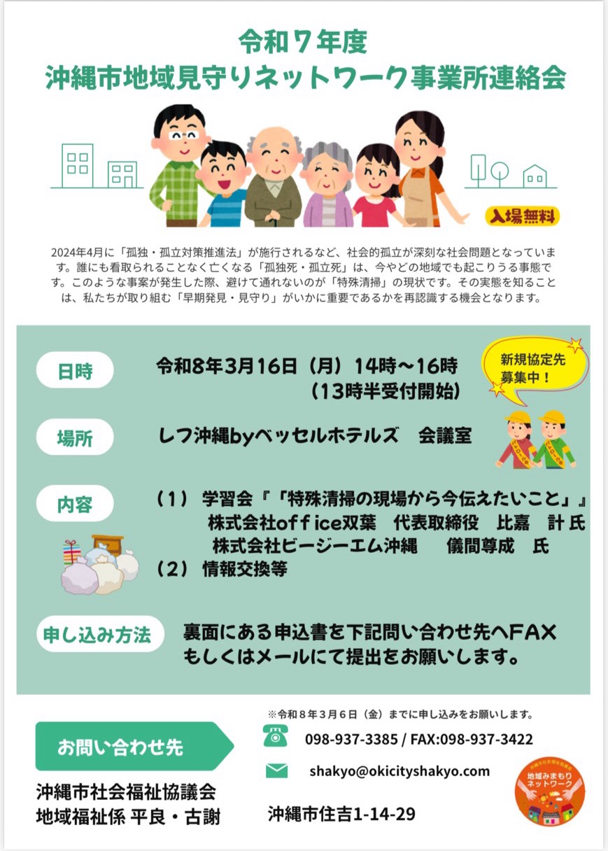 3月16日(月)沖縄市地域見守りネットワーク事業所連絡会にて「特殊清掃の現場から今伝えたいこと」としてセミナーに登壇させて頂きます。