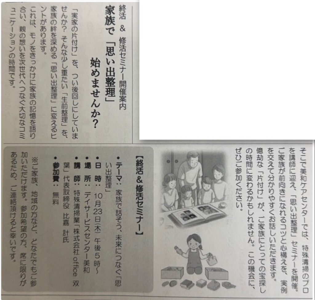 10月23日(木)うるま市有料老人ホーム「美和ケアセンター」にて終活セミナーに登壇させて頂きます。 2025.10.01 10月23日(木)うるま市にございます「高齢者複合快護施設:美和ケアセンター」にて終活セミナーに登壇させて頂きます。 10月23日(木)17時〜デイサービスセンター美和 ◯美和ケアセンター 投稿ナビゲーション 一覧へ戻る