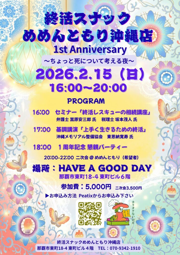 令和8年2月15日(日)終活スナックめめんともり沖縄店にて弊社が所属する終活団体「一般社団法人終活レスキュー協会」がめめんともり沖縄店1周年〜ちょっと死について考える夜〜にセミナー登壇させて頂きます。