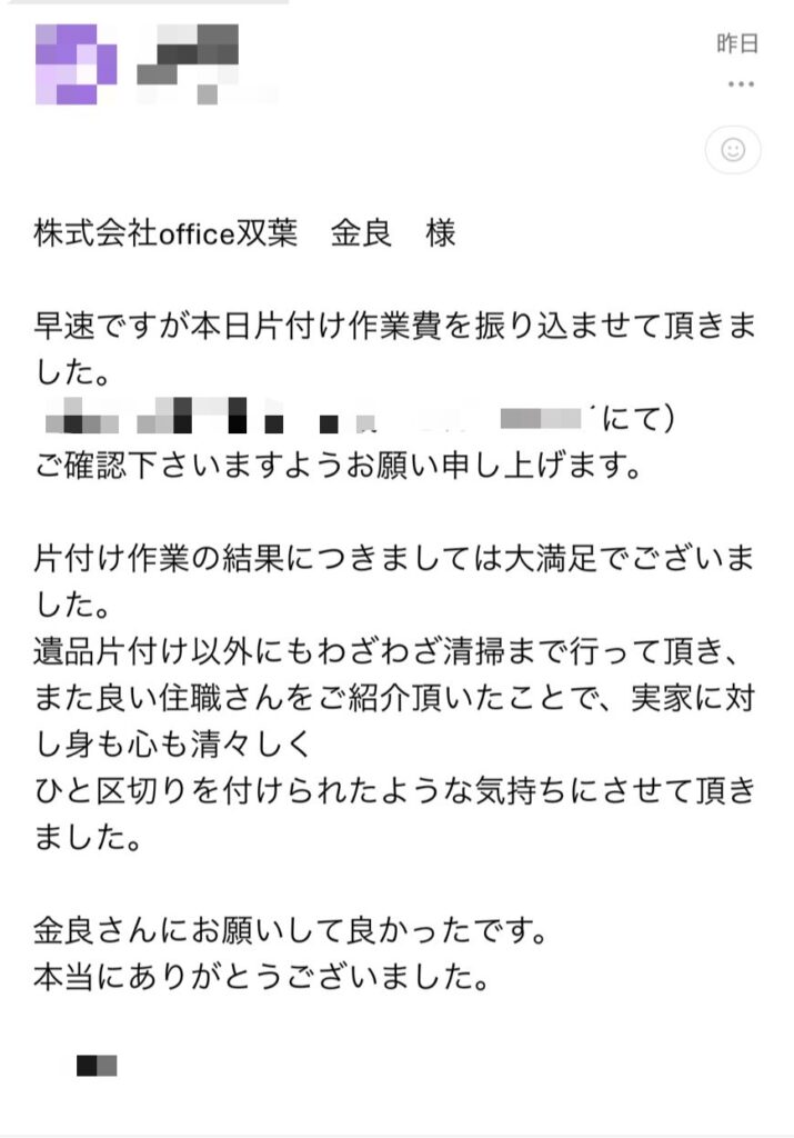 この度は遺品整理作業を弊社にご依頼頂き誠にありがとうございました。
